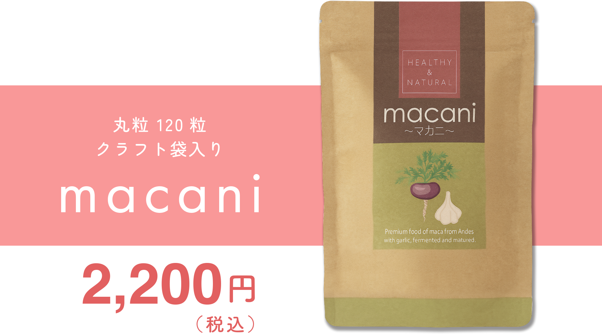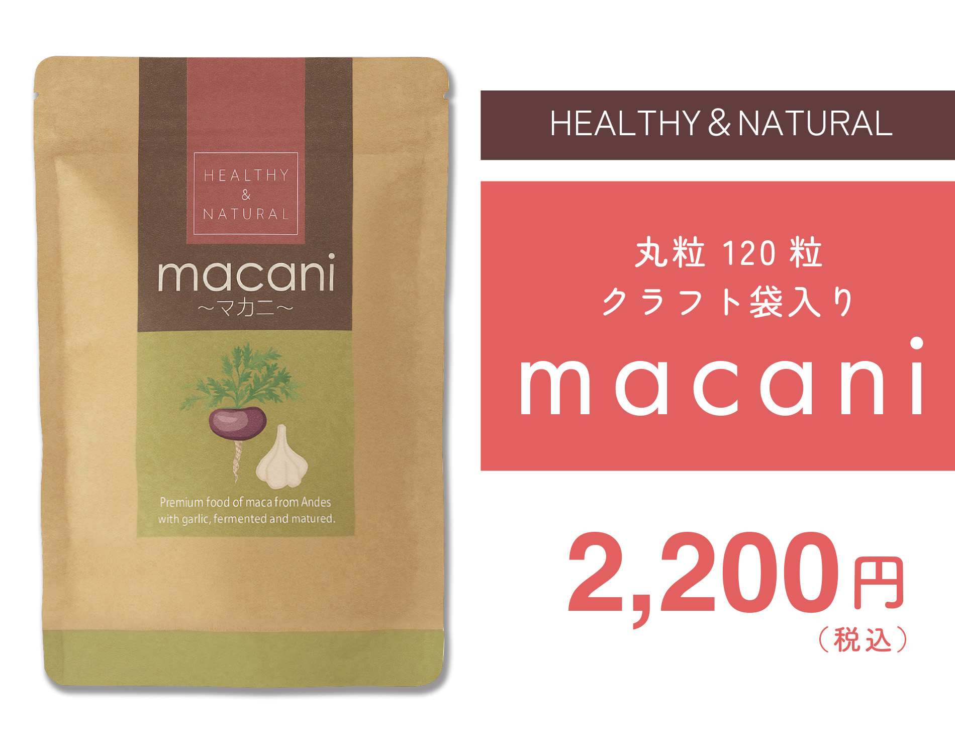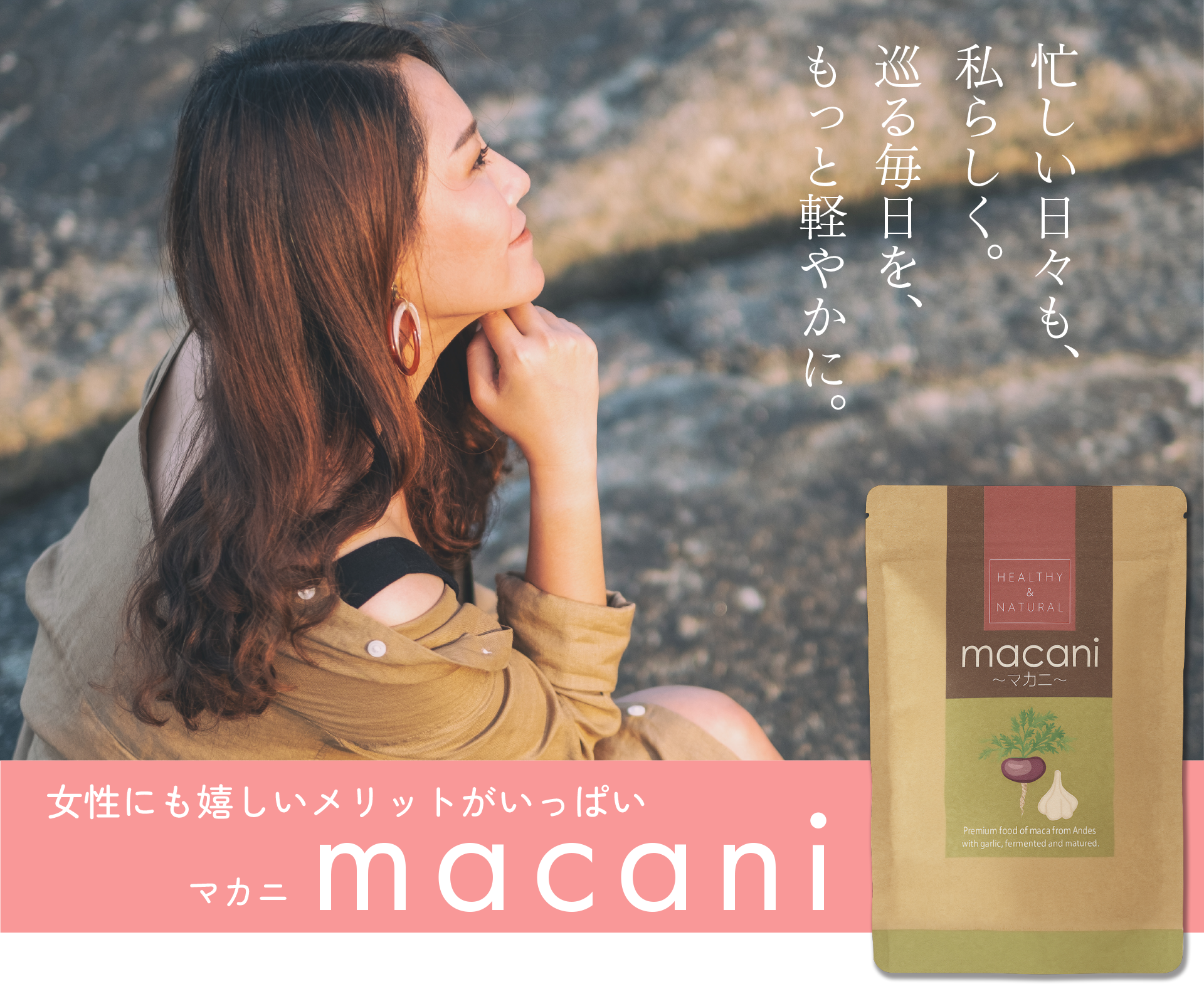 macaniはそんなスーパーフードのマカに、血行を良くし若々しさを保つということで疲労感、冷え対策として推奨されているニンニクを一緒に発酵・熟成させエナジー効果を高めたハイブリット・サプリ!